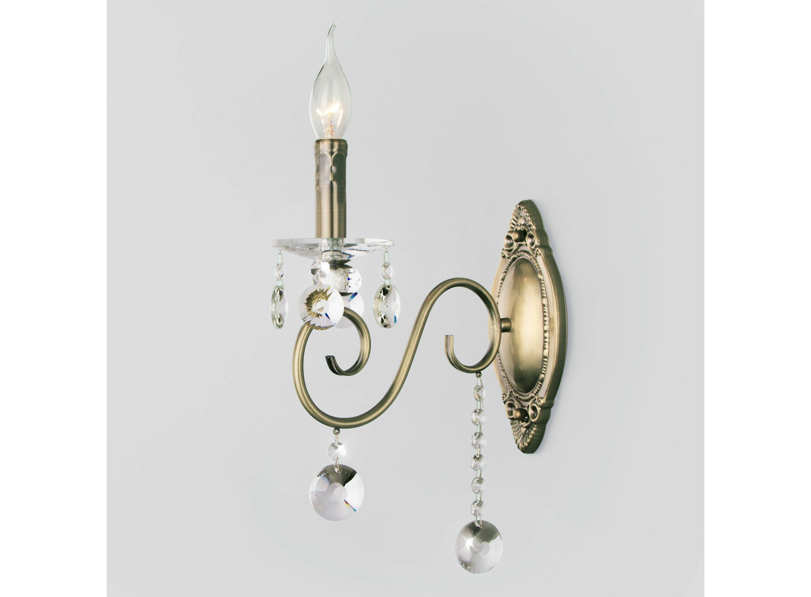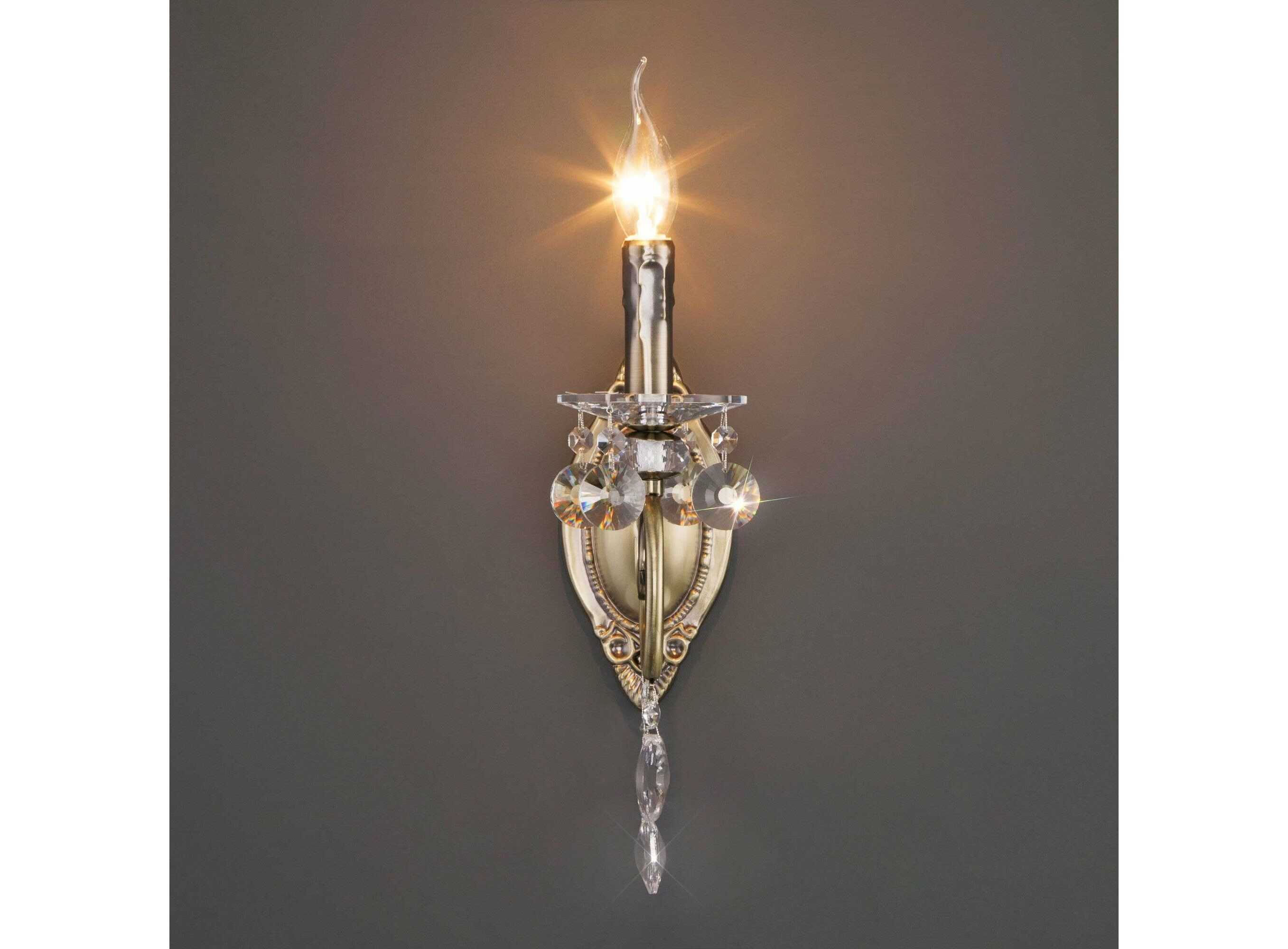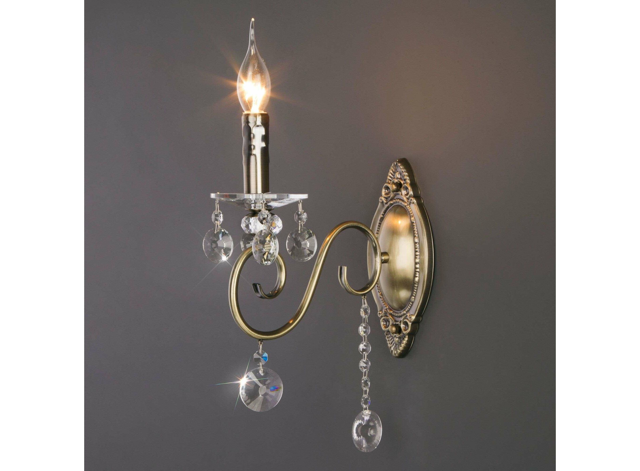 <p> Патрон рассчитан на максимальную мощность ламп накаливания 60 Вт. Корпус светильника выполнен из высококачественного и прочного металла с надежным покрытием. Бра легко устанавливается при помощи крепежной планки, которая обеспечивает надежную фиксацию светильника на стене. Классическое бра с изящными формами гармонично сочетается с хрустальными люстрами и станет отличным завершением композиции вашей гостиной или спальни.<p>
